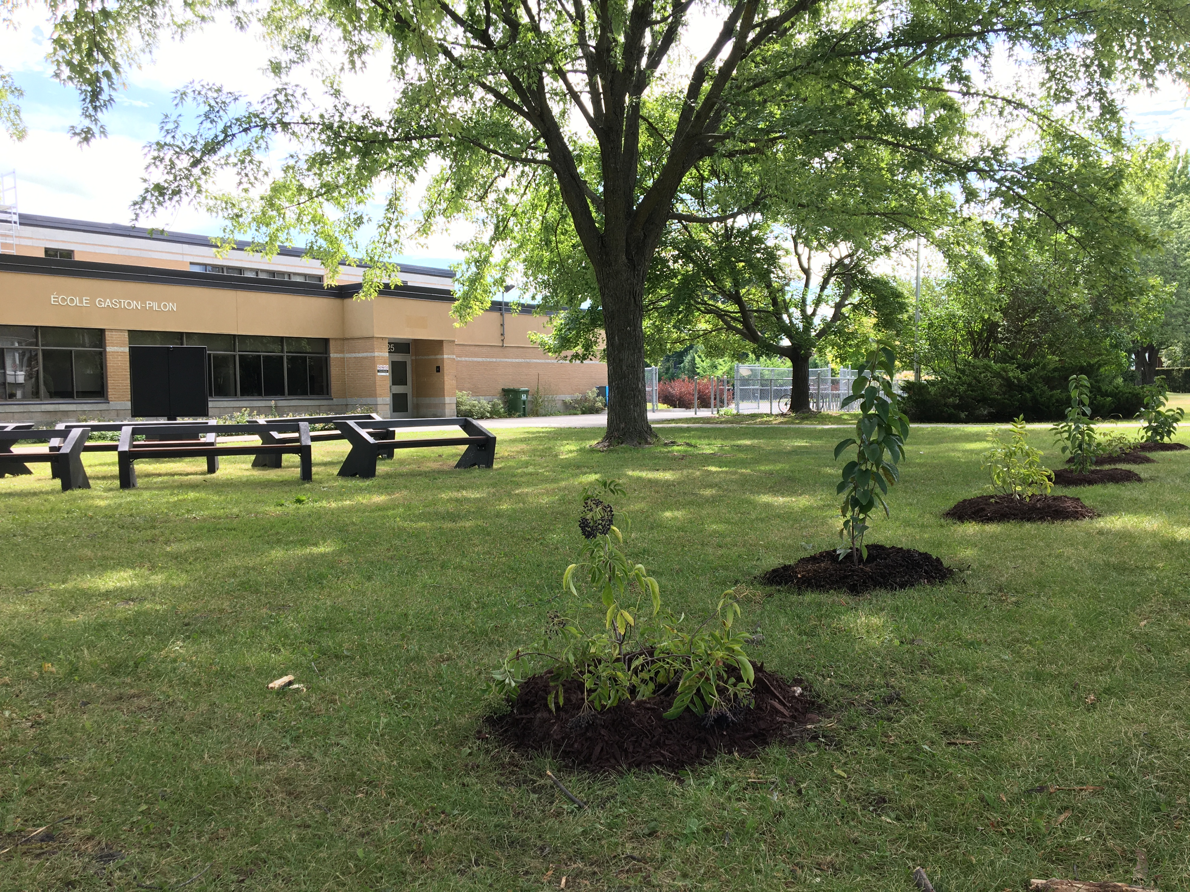 Sous le couvert de trois arbres matures, une nouvelle classe extérieure a pris racine à l'École primaire Gaston-Pilon! Étant contiguë à la rue, cette installation profite de 6 arbustes qui offriront un écran d'intimité favorisant un espace d'apprentissage paisible.