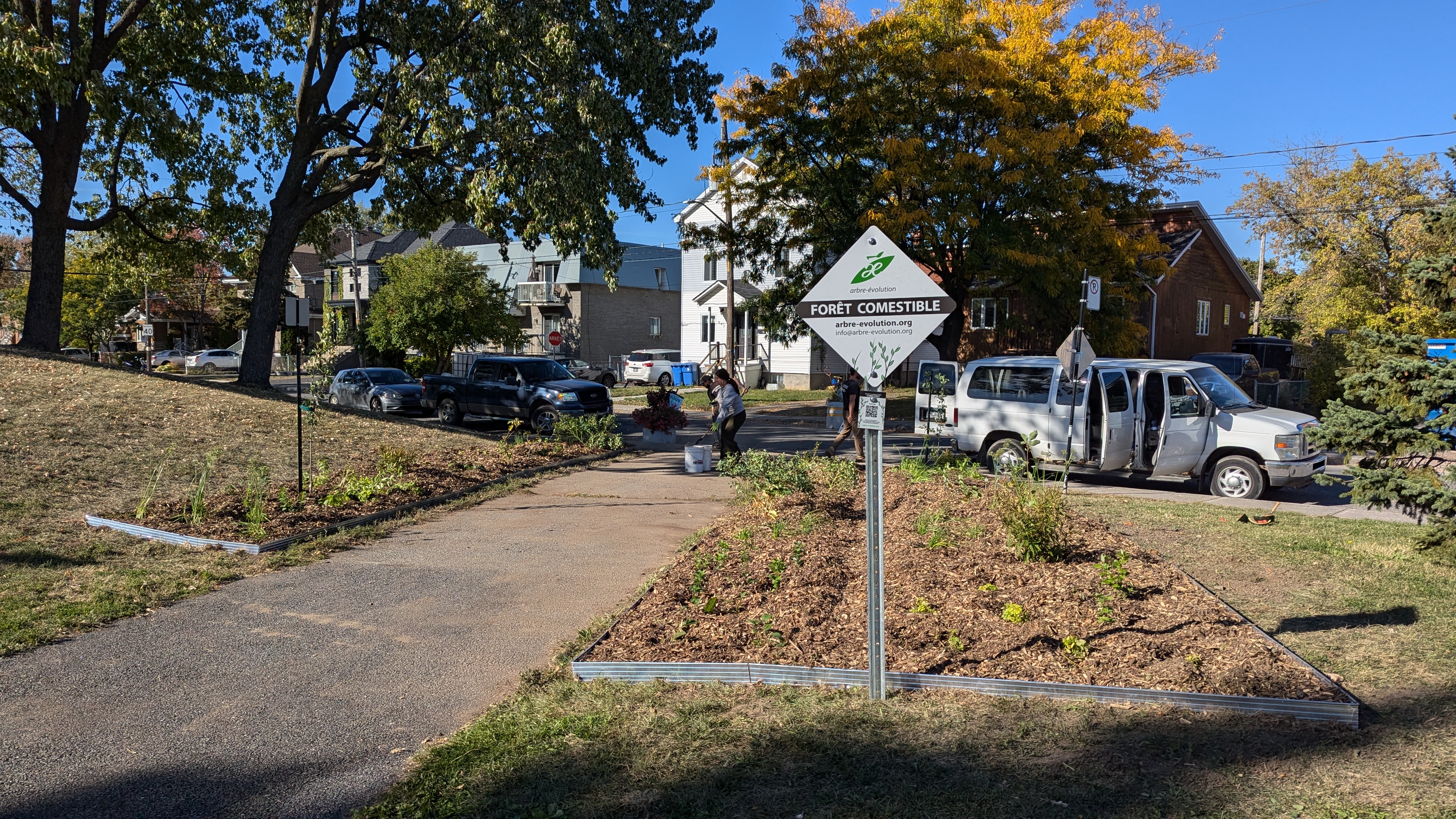 Au parc Fernand-Bouffard, ce sont 48 m2, en bordure du sentier, qui ont été aménagés par l'équipe de socio-arboriculteur.trices d'Arbre-Évolution. Près de 130 végétaux y ont été plantés, en s'inspirant des principes de permaculture. Vous trouverez donc : des plantes couvre-sol et répulsives comme la menthe et la mélisse ; des herbacées qui attirent les pollinisateurs comme l'échinacée ; des arbustes et des arbres fruitiers comme les groseilliers et les poiriers ; ainsi que des plantes fixatrices d'azote comme la comptonie voyageuse.